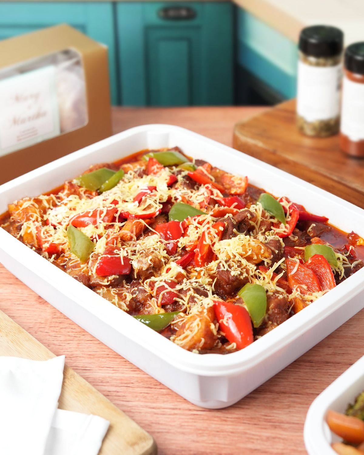 Filipino stew that features tender pieces of pork cooked in a tomato-based sauce with Red bell peppers, Green bell peppers, Potatoes and Carrots.